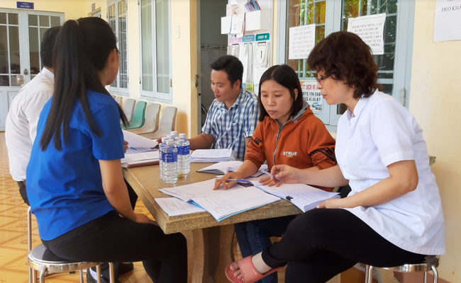 Cán bộ y tế Bình Phước đang kiểm tra lịch sử tiêm chủng tại địa phương.